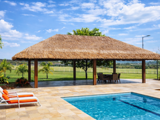Quiosque para piscina é a escolha perfeita para quem busca um toque natural ao seu ambiente de lazer. A estrutura do quiosque é construída com eucalipto citriodora tratado, garantindo não apenas solidez e resistência estrutural, mas também, uma estética rústica encantadora. O quiosque com cobertura de sapé traz um toque tropical ao seu espaço. Além de proporcionar uma sombra agradável, o sapê adiciona um clima acolhedor e natural. Permita-se envolver pela sensação autêntica de um quiosque de sapê á beira de sua piscina.